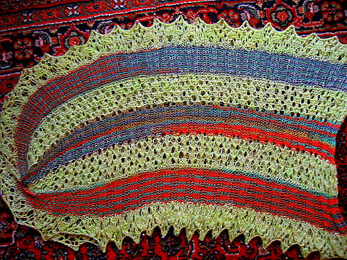 ein muster für ein kleines, feines, löchriges, leichtes tüchlein reizte mich. ich fand eines in ravelry namens 'garnomeras solero'. zwei, drei abende - ruckzuck war es fertig. für die hauptfarbe bediente ich mich an einem geschenk der firma wollust in berlin (coast yarn, tolles zeug übrigens), fuer die weiteren farben verwendete ich reste selbstgesponnenen und -gefärbten garns in wolle und kaschmir.